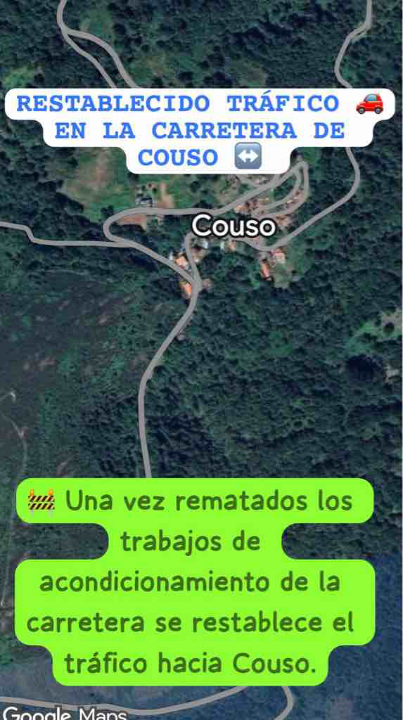 🚧 Una vez terminados los trabajos de acondicionamiento en la carretera de Couso, queda restablecido el tráfico de vehiculos de esta carretera. 🚗 Gracias por su comprensión y disculpad las molestias.